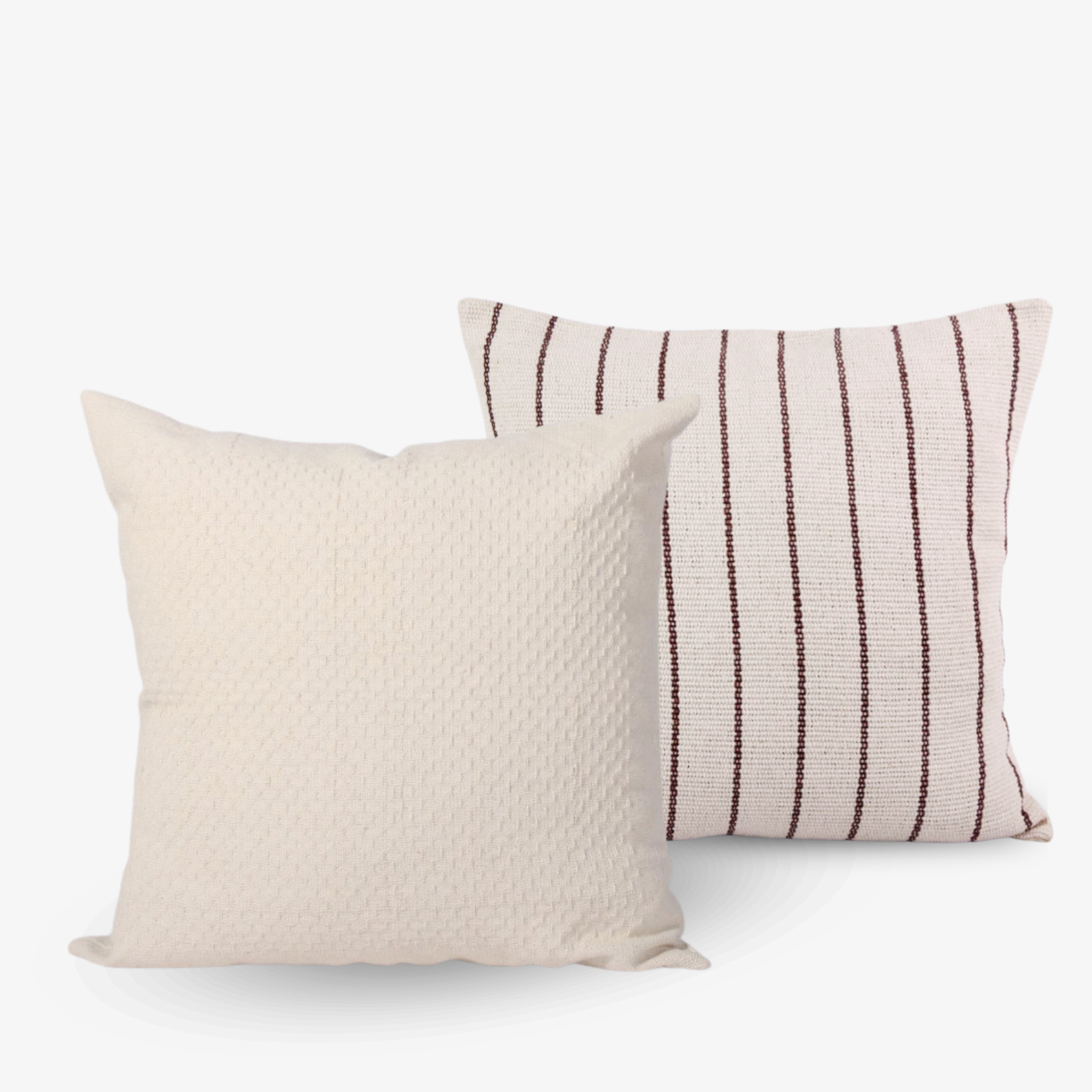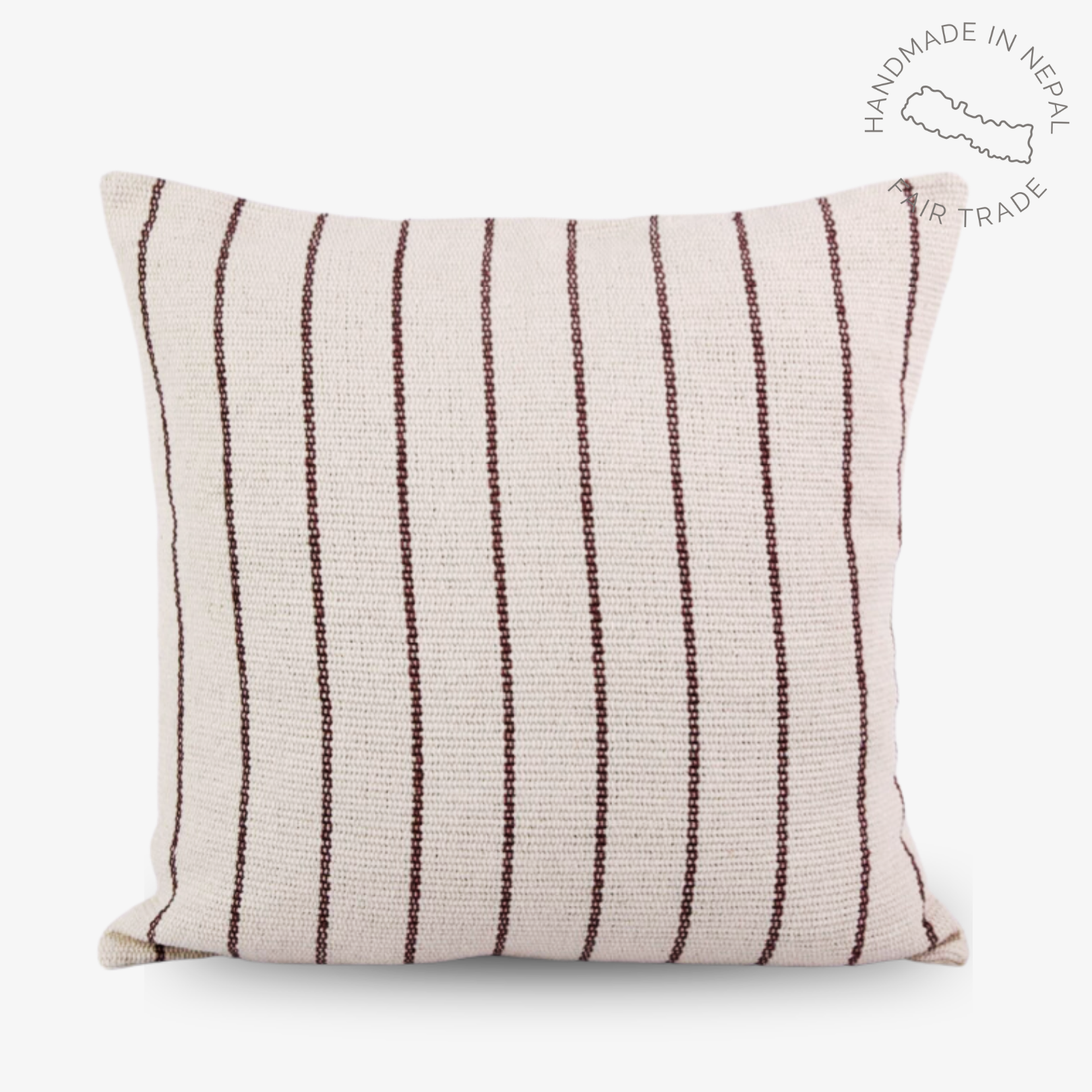 Handmade, Fair Trade striped cotton cushion with cotton backing and wooden buttons. Cushion insert is made in Denmark, with natural feather filling.
