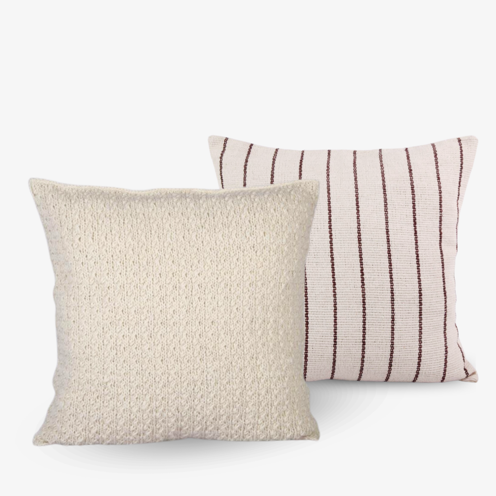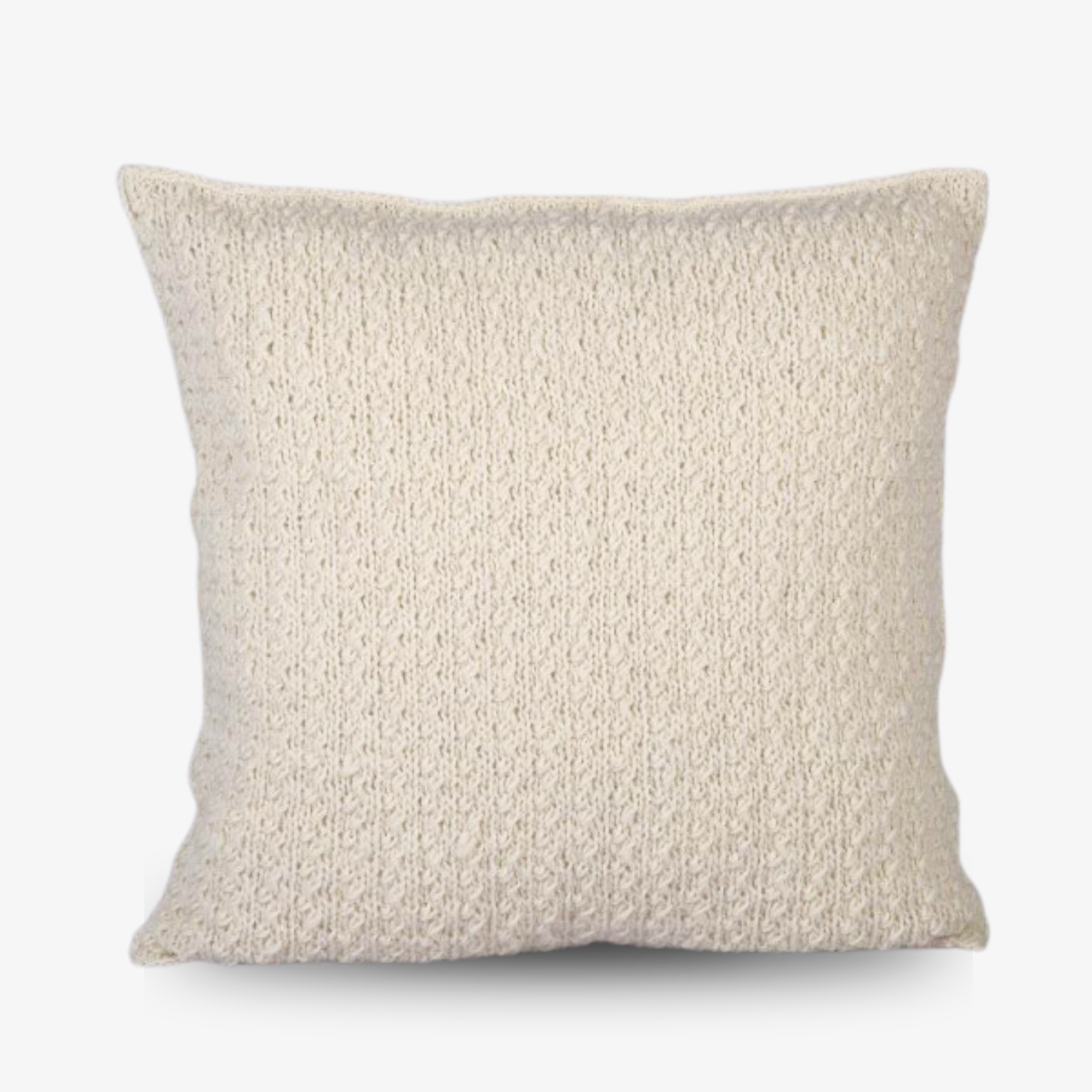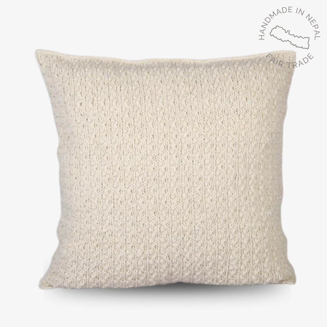 Hand knitted, Fair Trade wool cushion with cotton backing and wooden buttons. Cushion insert is made in Denmark, with natural feather filling.